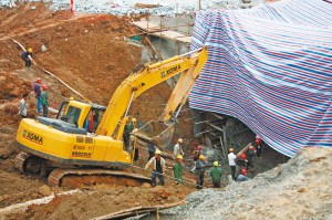 記者昨日上午趕到事故現(xiàn)場時,見20多名工人正在清理現(xiàn)場,一個長30多米、寬10余米的頂板整體垮塌,頂板下露出網(wǎng)狀的鋼筋,鋼筋全部彎曲變形,向下成彎弓形,工人們正在對塌方現(xiàn)場的鋼筋進行拆卸工作。