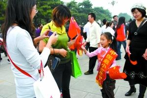 昨日,天安門廣場,6歲女孩唐樂琳免費(fèi)贈(zèng)送游客國旗。記者 張偉峰 攝