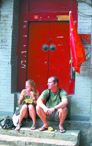 10月4日,一對(duì)外國(guó)情侶在南鑼鼓巷一個(gè)掛著國(guó)旗的小院門口邊吃小吃邊欣賞胡同風(fēng)情。 本報(bào)特約攝影 羅偉