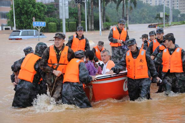 連日暴雨使海南文昌市區(qū)一片汪洋,海南省軍區(qū)官兵出動千余官兵奮力救災。圖為官兵從洪水中轉(zhuǎn)移被困群眾。肖雙劍 攝