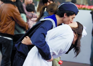 活動(dòng)開始后,分四個(gè)區(qū)域排好隊(duì)的情侶們開始接吻。一名男子穿著藍(lán)色水兵服,女孩身穿護(hù)士服,“水兵”輕攬“護(hù)士”腰際,“護(hù)士”閉目上身傾倒,原來,他們?cè)谀7轮摹笆兰o(jì)之吻”。