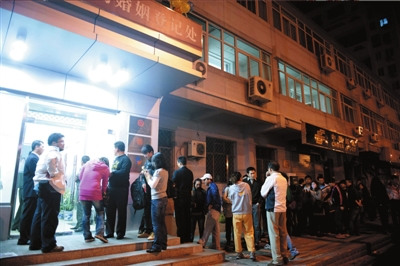 為了早點(diǎn)領(lǐng)到結(jié)婚證,一對對情侶不惜午夜就開始排隊(duì)等候。