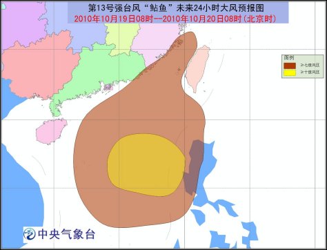 今年第13號(hào)超強(qiáng)臺(tái)風(fēng)“鲇魚”已于10月18日20時(shí)在菲律賓呂宋島北部減弱為強(qiáng)臺(tái)風(fēng),18日22時(shí)前后進(jìn)入南海東部海面。19日05時(shí)強(qiáng)臺(tái)風(fēng)“鲇魚”的中心位于南海東部海面上,就是北緯16.8度,東經(jīng)118.8度,中心附近最大風(fēng)力有15級(jí)(50米/秒),中心最低氣壓為945百帕。