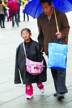昨日,天安門廣場,一名游客脫下自己的皮夾克給孩子穿上。本報記者 周曉東 攝