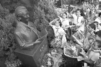 9月10日,全國首批特級教師、被溫家寶總理稱為“把愛獻(xiàn)給教育的人”、“愛的教育”的倡導(dǎo)者和實踐者——霍懋征銅像揭幕儀式在北京實驗二小舉行。圖為該校師生為霍懋征銅像獻(xiàn)上鮮花和紅領(lǐng)巾,紀(jì)念這位杰出的教育家。張斌攝(資料圖片)