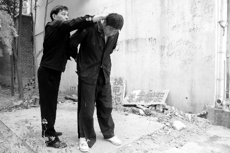 李付俊(右)找人還原當(dāng)晚他頭被摁住的情形。他的右褲腿右側(cè)從下到上被撕開,他說是執(zhí)法人員干的。見習(xí)記者 趙卓/攝