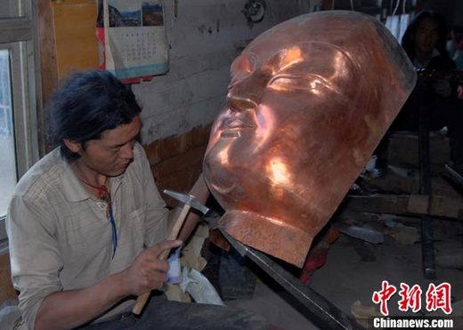 根據(jù)頓珠的介紹,打佛像的工序一般分為敲、焊、燒,10個(gè)人各有分工!半y度最大的是佛像的頭和手”,頓珠說,打佛像沒有模型,全部靠常年累計(jì)的經(jīng)驗(yàn)和工藝感覺,只有經(jīng)過專業(yè)訓(xùn)練的人才能勝任。