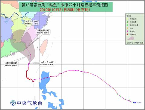 預(yù)計,“鲇魚”將以每小時5-10公里的速度向偏北轉(zhuǎn)北偏西方向移動,逐漸向廣東東部到福建南部沿?拷⒂锌赡苡22日夜間到23日白天在廣東汕尾到福建廈門一帶沿海登陸,登陸時強(qiáng)度可能為臺風(fēng)。