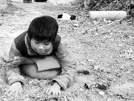 地上的小思思,一臉的麻木,正在扒土;記者走近,她“嘿嘿”笑了一下。思思的腰間,拴有一條用布條擰成的粗繩子。“一開始是用鐵鏈子拴住腳脖,后來磨出了血泡,沒辦法才用破衣服撕成條擰成繩子拴在腰間!彼妓嫉哪棠汤畹罉s說。