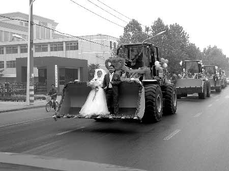 “工人老大哥結婚的典范”,“個性婚禮的最新發(fā)展”,“不能說后無來者,但絕對是前無古人”……昨日,大河論壇中一則題為“雷聲滾滾,鷹城街頭驚現鏟車迎親車隊”的網帖引來無數網友跟帖。