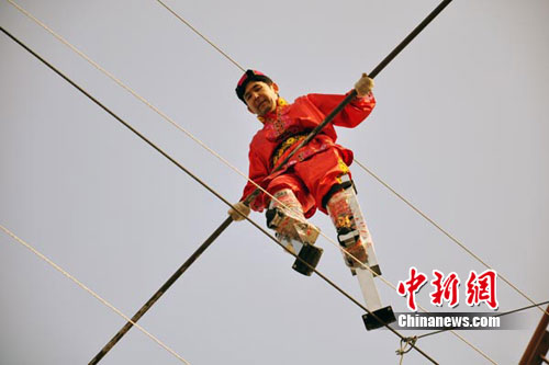 圖為賽買提·依明正手拿平衡桿在距離地面12米的高空鋼絲上埰著60厘米的高蹺行走。
