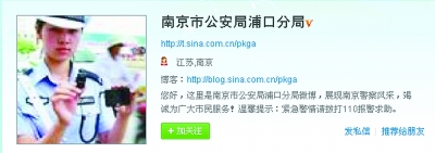 據(jù)微博管理員提供的數(shù)字顯示,全省共有33個公安機(jī)構(gòu)開了官方微博。雖然江蘇省公安廳的官方微博尚未開通,但在13個省轄市中,常州、連云港、揚(yáng)州三市的公安局開了微博,無錫市也在醞釀中。昨天記者獲悉,南京市公安局浦口分局在注冊的官方微博也已正式開通運(yùn)行,這是南京市公安機(jī)關(guān)推出的首個警方官方微博。