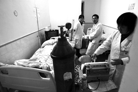 隔著窗戶,記者看到搶救室是一間病房,里面有氧氣瓶和監(jiān)護(hù)儀等設(shè)施。死者靜靜地躺在病床上,身體被被子包裹著,在他身旁,監(jiān)護(hù)儀顯示心跳已成一條直線。室內(nèi),4名醫(yī)護(hù)人員無奈地或坐或站。在他們記錄的病歷上顯示,他們已被困在屋內(nèi)好幾個(gè)小時(shí)了。