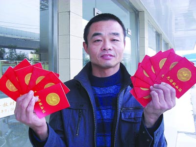 宋強(qiáng)向記者展示他的14本獻(xiàn)血證。旺財(cái) 凌云 攝