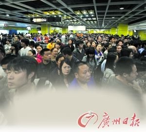 昨日,廣佛兩地很多沒有飲上“頭啖湯”的市民擠往廣佛線,導(dǎo)致該線全天客流爆滿。西朗站因?yàn)榭土髁刻螅瑥淖蛉赵缟系酵砩弦恢睂?shí)行客流控制。
