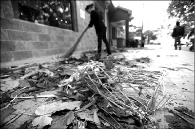 大量鮮花殘骸散落,店內(nèi)的服務員正在清掃。本報記者 潘之望 攝
