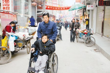 李存良推著兒子前往學(xué)校。(記者劉珂 實習(xí)生趙曉龍/攝)