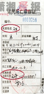 當事醫(yī)生隨后被叫來與家屬見面,這位左醫(yī)生說,死者原本是另一位肖姓醫(yī)生的病人,當時死者家屬等了很久,但肖醫(yī)生一直很忙,便叫他代開證明,“證明一共有三聯(lián),一聯(lián)是給醫(yī)院的存根,一聯(lián)給派出所銷戶口,另一聯(lián)給殯儀館。我們查過,存根那一聯(lián)沒寫錯!