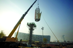 昨日,鳥巢奧運(yùn)主火炬在鳥巢北廣場進(jìn)行吊裝。記者 秦斌 攝
