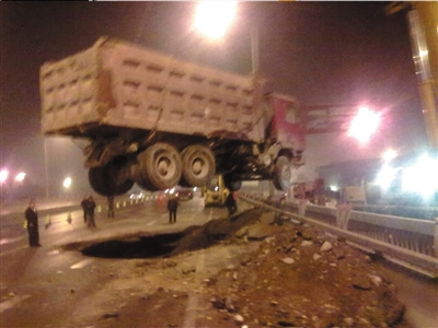司機(jī)劉先生稱:“當(dāng)時我開車行駛在最外側(cè)車道,路非常平坦,不知為何前面的大貨車顛簸了一下,我趕緊左打輪,但還沒反應(yīng)過來,我的車后輪就‘咕咚’一下陷進(jìn)去了。”他趕緊抓住車棚上的一個部位,車體下陷時,他“吊”在車駕駛室內(nèi)!靶姨澪曳磻(yīng)快,不然頭就撞車門上了。”他下車后發(fā)現(xiàn),貨車陷在了約兩米深的大坑里?幽蟼(cè)有一條十幾米長的裂縫,他怕會再次發(fā)生坍塌,于是迅速在車后放上路障并打電話報警。