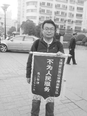 其實(shí)我一共做了三面錦旗。最早的一面9月份做的“起訴通用工會法院不受理”,給無錫新區(qū)法院的!安粸槿嗣穹⻊(wù)”是給勞動保障監(jiān)察大隊(duì)的。第三面還是給法院的,寫的“行政訴訟立案難”,還沒送出去。現(xiàn)在看來第二面最受歡迎。
