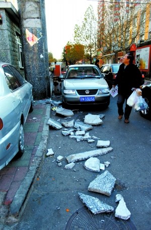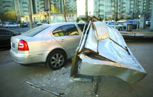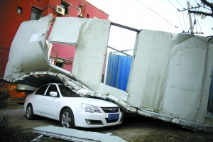 昨日,西三旗一處地鐵工地的一簡易房被大風(fēng)吹到隔壁小區(qū)砸中一輛車。當(dāng)日,北京刮起8級大風(fēng)。記者 浦峰 攝