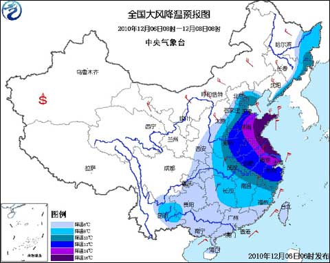 中央氣象臺2010年12月6日06時繼續(xù)發(fā)布寒潮藍(lán)色預(yù)警:預(yù)計,12月6日08時至8日08時,陜西東南部、華北中南部和東部、東北東部、黃淮、江淮、江漢、江南、華南及貴州、云南東部、重慶等地將出現(xiàn)6~10℃降溫,其中,華北東南部、黃淮、江淮、江南東北部等地的部分地區(qū)降溫幅度可達(dá)12~16℃;淮河以北大部地區(qū)有5~6級偏北風(fēng),江淮、江南有4~5級偏北風(fēng)。