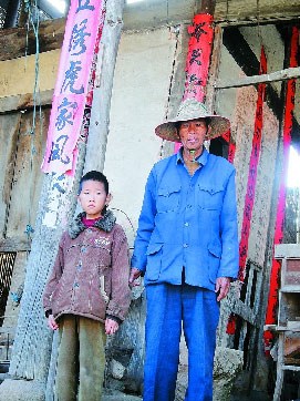 這對沿街乞討的老少是父子倆。父親叫大煌,兒子叫以湊。據(jù)村里人介紹,以湊其實是大煌的養(yǎng)子。大煌今年72歲,以湊8歲。
