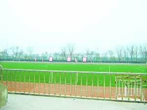 通過門向體育場內(nèi)部望去,除看臺一側(cè)外,塑膠場地仍顯得非常清潔。只不過掛在鐵絲網(wǎng)上的標(biāo)語,已被風(fēng)吹落,只看得清“健……你……同”三個大字。