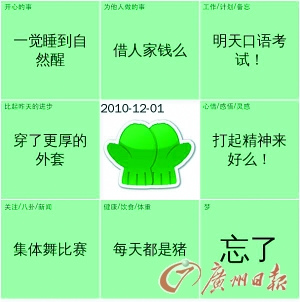 上學(xué)的時(shí)候,寫日記是很多人都覺得挺麻煩的一件事,“每天都在學(xué)校,有什么值得記的呢?”近來,一種叫“九宮格日記”的小玩意卻讓這些年輕人又恢復(fù)了寫日記的習(xí)慣。在網(wǎng)上搜索,很容易就能找到提供這種服務(wù)的網(wǎng)站。經(jīng)過注冊后,就可以開始寫日記啦!不過,這個(gè)“日記本”可有點(diǎn)特別,是一個(gè)被分成了九個(gè)小方格的一個(gè)大方塊,每一個(gè)小方格上都寫明了這一格的主題,比如“開心的事情”、“今天比昨天的進(jìn)步”、“心情感悟”等等。當(dāng)完成了全部九個(gè)格后,一篇“九宮格日記”就大功告成了。