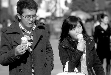 12月7日,蓉城街頭兩位青年愜意地吃著冰激凌 郭廣宇 攝