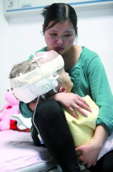 昨日,八一兒童醫(yī)院,1歲3個月的山東“大頭女嬰”劉昱含躺在媽媽懷里。主治醫(yī)生稱,孩子顱內(nèi)都是積水,已經(jīng)沒有太多腦組織。即使手術順利,孩子能站起來就是奇跡。據(jù)悉,手術費需要五六萬元,因經(jīng)濟困難,目前劉昱含只能接受保守治療。孩子父親劉偉說:“無論怎樣都不會放棄,哪怕讓我乞討,這是做父母的責任。” 記者 韓萌 攝