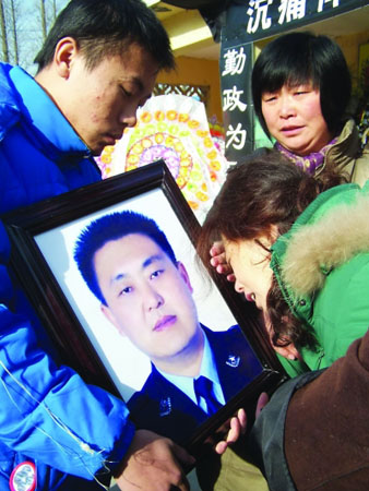 8日上午10時(shí),在陳銳的追悼會(huì)上,妻子姚愛悅哭泣著將丈夫的人民警察證握在手心,一遍一遍親吻那張被相機(jī)微縮了的面孔;16歲的兒子陳耀宇手捧父親的遺像,早已哭干了眼淚!拔覀円患胰谶沒有合過影,爸爸答應(yīng)說過一陣子去補(bǔ)拍一個(gè)全家!标愐钫f!