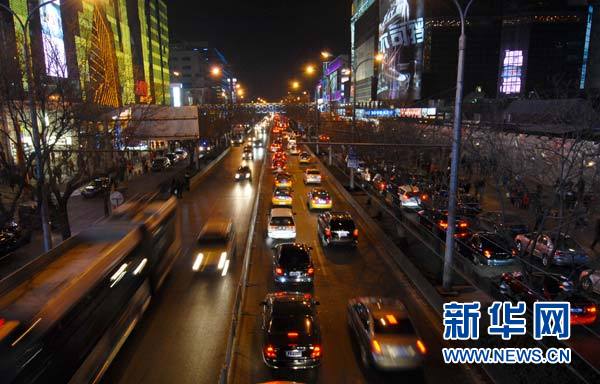 12月12日晚,北京西單大街路邊停滿機(jī)動(dòng)車,主路由南向北方向行駛緩慢。新華社發(fā)(張宇 攝)