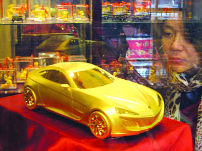 昨天,在南京寶慶銀樓舉辦的金條展上,一輛由純金打造的黃金汽車在南京首次亮相,成為當天展會最大的亮點,別小看它只是一個汽車模型,它可用了足足5公斤黃金,按時下的金價計算,市價值300多萬元呢,一點不比那些真正的跑車便宜。記者在展銷會上看到,除價值不菲的黃金跑車外,寶慶銀樓今年還推出了兔年生肖金條、記載祖宗淵源的姓氏金條等特色產品,重量從10克到1.5千克不等。其中,投資金條在上海金交所基礎金價上每克加價10元銷售,工藝金條每克加價15元。(陳春林)