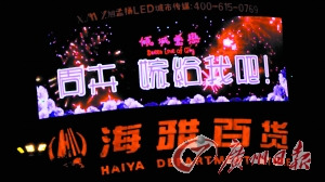 當(dāng)晚8時(shí)整,南城鴻福路口人流穿梭,熙熙攘攘,周末時(shí)光,逛街休閑的市民明顯比平時(shí)多了很多,就在這時(shí),海雅百貨大樓上的LED大屏幕突然中斷正在播出的內(nèi)容,隨之出現(xiàn)一段浪漫求婚大片吸引了路人的眼球。