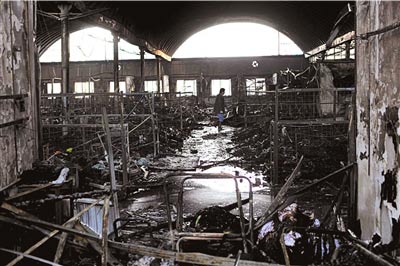 菜市場(chǎng)內(nèi)被燒得一片狼藉。本報(bào)記者朱嘉磊攝