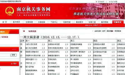 12月12日深夜,南京市級機關(guān)事務管理局網(wǎng)站上的“每周菜譜”,被網(wǎng)友截圖發(fā)布在各大網(wǎng)站上后,引起數(shù)萬名網(wǎng)友圍觀,大呼“真豐富、真便宜,菜價貴都是浮云……”