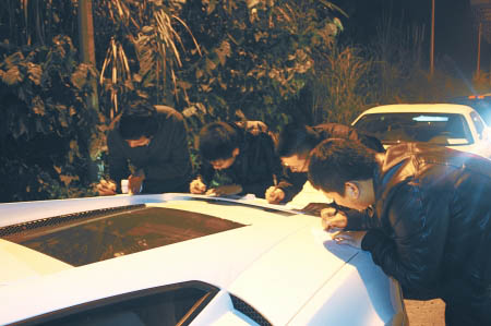 李磊、吳鵬接到攔截令后,眼睛一直盯住駛來(lái)的豪華跑車(chē)。晚上6點(diǎn)40分左右,李磊、吳鵬發(fā)現(xiàn)一輛蘭博基尼、一輛奔馳SLSAMG和兩輛保時(shí)捷911豪華跑車(chē)開(kāi)到施工變道緩行段上來(lái)。在這里,任何豪華跑車(chē)都只能緩慢行駛。一會(huì)兒,鄧建明、程飛的警車(chē)也追趕上來(lái)。