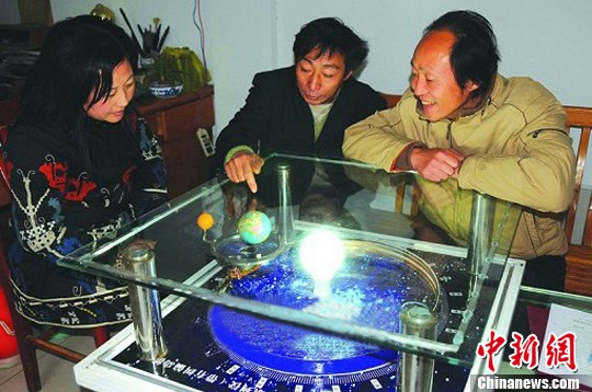 河南社旗縣47歲農(nóng)民張家云,高中畢業(yè)沒學(xué)過地理卻發(fā)明了天體運(yùn)行儀器“地月日三星儀”,并獲得一些專家的關(guān)注。