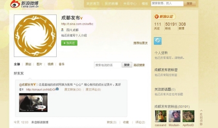 “微博最大的優(yōu)點就是幾乎可以實時傳播。”成都市政府新聞辦有關(guān)工作人員說,他們也一直在關(guān)注這項新生事物,當意識到微博也可以成為信息公開發(fā)布的快速渠道時,他們隨即在新浪網(wǎng)實名認證,注冊了名為“成都發(fā)布”的微博。