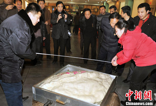 據(jù)介紹,該水餃,長1.2米、寬0.86米、重達158斤,用了足足三袋面粉、60斤餃子餡。而該大水餃的肚中還包有2011個小水餃,這些小水餃有豬肉、羊肉和白菜、韭菜等60多種風(fēng)味的餡包成,夠100多個人同時吃飽。在該縣公證處等有關(guān)部門的監(jiān)督下制作完成的特大水餃將申報世界吉尼斯記錄。