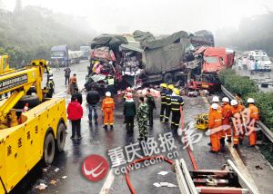 昨日(22日)凌晨,濃霧鎖城,渝遂高速公路能見度不足20米。上午8時許,渝遂高速遂寧往重慶方向青木關(guān)路段發(fā)生多起車禍,2公里長的公路上,幾十輛大貨車、客車及轎車相繼撞在一起,事故共造成5人當場死亡、10人受傷。