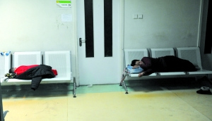 “得等四天才能做上檢查,還不知道住哪兒呢?”在醫(yī)院二層樓道盡頭的角落里,從保定來的趙德江正蹲在墻角喝水,在身邊的長椅上,患病的孩子由媽媽和姥姥在照顧,一個裝著他們全部家當?shù)呐W新眯邪旁诘厣稀Zw德江告訴記者,他兩個月大的女兒眼睛總是不自然地四處轉動,在當?shù)蒯t(yī)院做了全面檢查后,醫(yī)生懷疑與腦神經有關,建議他帶著孩子“去北京找專家”!皺z查預約在下周二,外面最便宜的住一晚上也80元,這還沒看上病呢,仨大人就得花不少錢!庇谑勤w德江琢磨著,先在醫(yī)院里待著,“等有人轟的時候再想辦法!庇浾呖吹剑褛w德江這樣為省下錢給孩子看病而拖家?guī)Э谠卺t(yī)院樓道內打游擊的家長并不在少數(shù)。