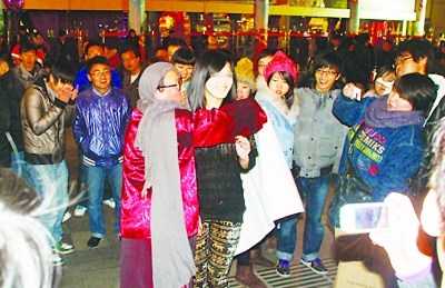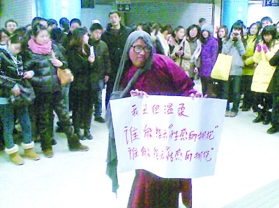 圣誕節(jié)的夜晚,南京街頭人頭攢動,而在新街口地下通道更是出現(xiàn)了火爆一幕,讓人驚叫連連。原來,一個打扮怪異,手舉“我丑但溫柔,誰能給我性感的擁抱”的大紙牌的中年男子,正在旁若無人的擺出各種造型。