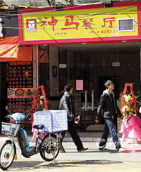 網(wǎng)絡(luò)流行語“神馬都是浮云”走進(jìn)了現(xiàn)實(shí)。26日,廣東外語外貿(mào)大學(xué)北門的叢云路上,兩個(gè)大四畢業(yè)生開的“神馬餐廳”開張,宣稱“神馬最給力?神馬餐廳最給力!”