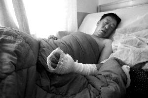 昨日,右安門醫(yī)院,被砍傷的南苑村村民王佐柱正在接受治療。 王貴彬 攝