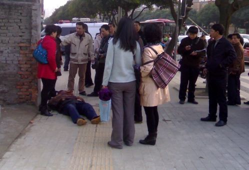 “這有探頭,女孩子還是不要扶,這種事情說不清楚呀!眹^人群中突然冒出這句話。兩個女孩思量了許久,最終把手縮回去了,彼此相望了一下,然后起身,撥打120、110。