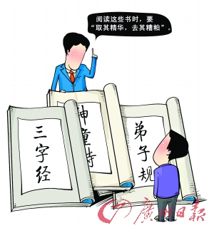 武昌區(qū)九龍井小學(xué)語文教研組主任魏賢佐介紹,該校在教學(xué)生讀經(jīng)典時(shí),重新選擇文章,對(duì)《三字經(jīng)》、《弟子規(guī)》、《增廣賢文》等經(jīng)典文本進(jìn)行了打印編排,“中國(guó)國(guó)學(xué)經(jīng)典中大多數(shù)內(nèi)容都是好的,但也有一些不科學(xué)或與時(shí)代發(fā)展相悖的東西,如封建思想嚴(yán)重,輕視女性、輕視勞動(dòng)等”。