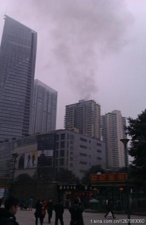 觀音橋某大廈起火,冒起濃煙。 網(wǎng)友供圖 來源:華龍網(wǎng)